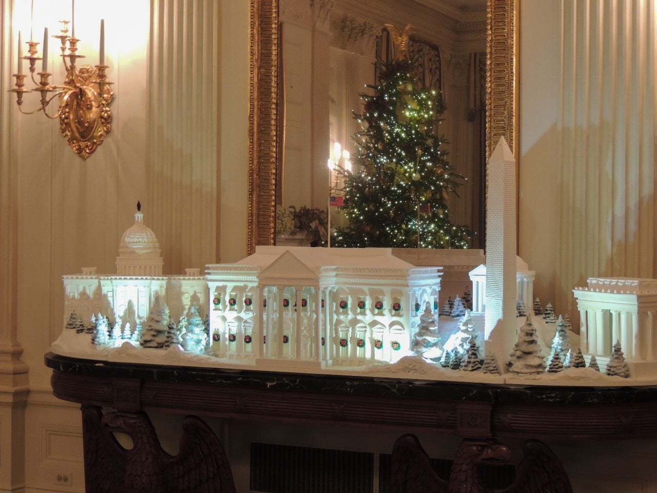 A meal is sadly not included in the White House tour, but, if it was, the State Dining Room would be the logical place for it to be served. It can accommodate over 100 guests, but my blue jeans likely would have needed a serious upgrade. Eagles support the furniture and topped the trees in homage to one of our national symbols. A large edible gingerbread creation sat under one of the classic White House mirrors and depicted famous monuments and structures on the National Mall. The piece was made with almost 400 pounds of ingredients by the pastry team.