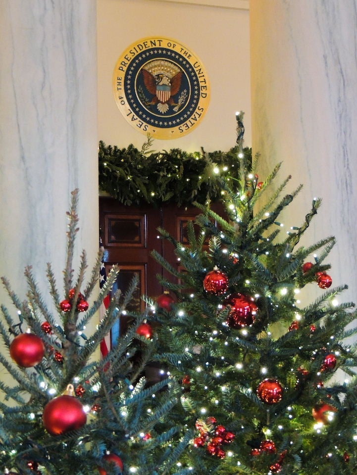 As we turned the corner, we came up the East Colonnade, which was lined on both sides with bright red berry trees of varying heights naturally lit by the multiple large windows that look out into the Kennedy Garden. The trees had received some unfavorable reviews when first introduced, and we were curious as to what our impression would be in person. When standing in front of the trees, we found them to be colorful, festive and appropriate for the season. A muted green carpet provided a seasonal balance to the somewhat narrow walkway. Judging by the number of photos being taken of the trees, they seem to be a hit with the crowd. Fortunately, cameras (with some limitations) are permitted on the White House tour.
