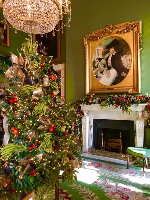 After exiting the East Room, the famous Red, Green and Blue rooms were only steps away. The Green Room now serves as a parlor for small receptions. Its decorative theme for the holidays illustrated and highlighted the great work ethic of American farmers and the fruits of their labor. Harvested produce, grains and nuts were found in the garland on the mantle, the boughs of the tree and as accents on the tables.