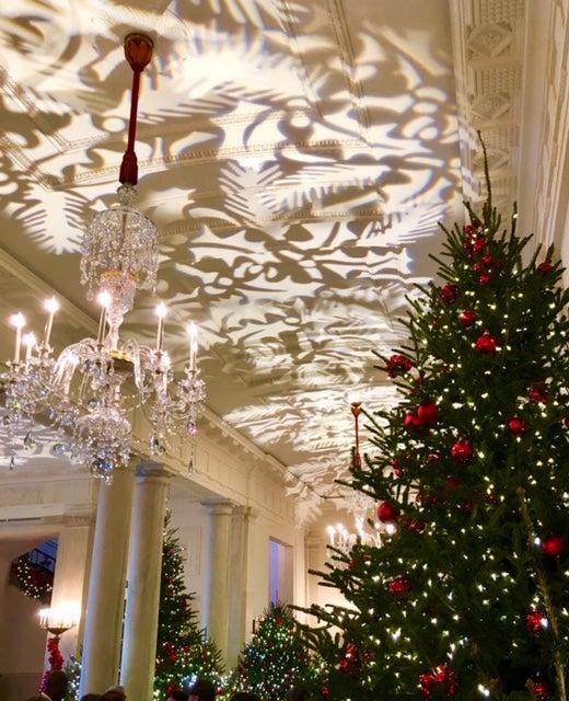Thousands of red ornaments lined the hallway and graced the trees' deep green branches. The scene was so rich with Christmas spirit that we fully expected Bing Crosby and Rosemary Clooney to come out from behind the trees singing "White Christmas" at any second. The projected light on the ceiling added sparkle and pizzazz to a room that was already a full holiday palette. The presidential seal rising above the multilayered décor was a popular photo op for all.