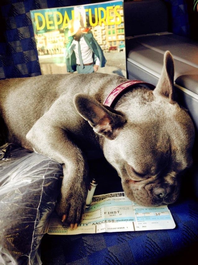 The first time I flew with Miles, I was so stressed out. What was it going to be like going through security? What if he started peeing all over the place? Make things easier on yourself by making sure you wear your dog out with exercise before the flight, don't feed him/her too much in advance, and have them take a bathroom break right before a flight.