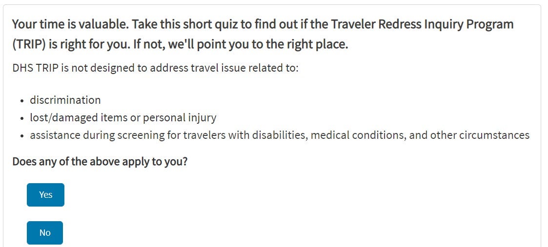 You must first take a "quiz" to determine if you really have a redress issue. If your travel issue is related to "discrimination; lost/damaged items or personal injury" or "assistance during screening for travelers with disabilities, medical conditions, and other circumstances," DHS will point you to another program.