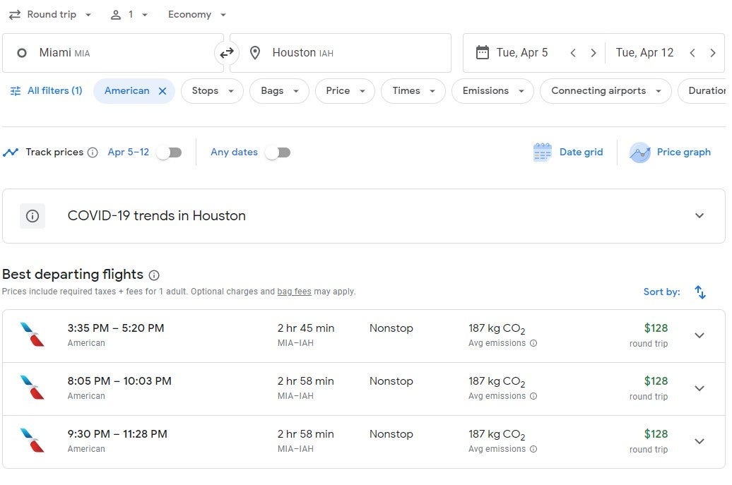 For the same $128 fare, travelers have many options from Miami (MIA) to Houston (IAH) throughout February, March and April.