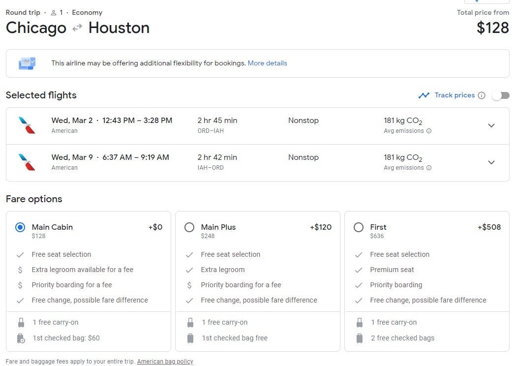 One of the cheapest deals we found was a nonstop flight from Chicago (ORD) to Houston (IAH) for $128 round-trip at the beginning of March.